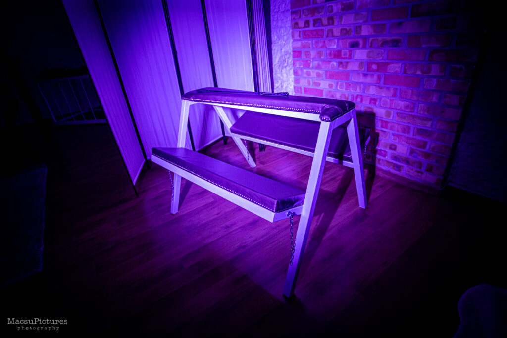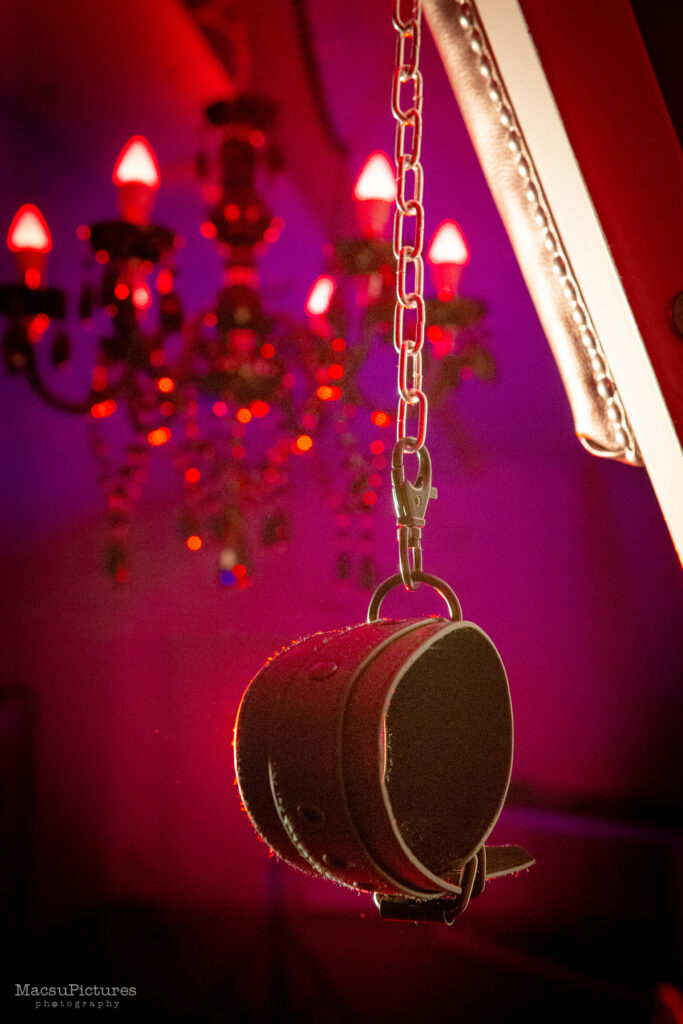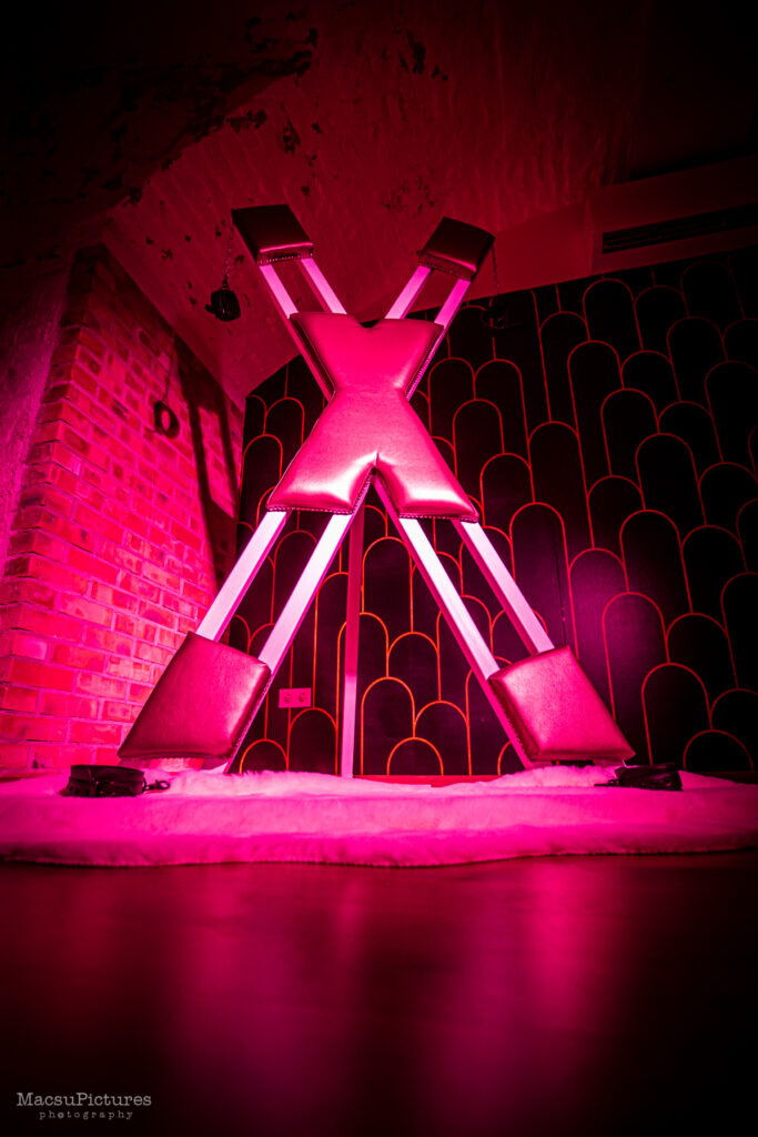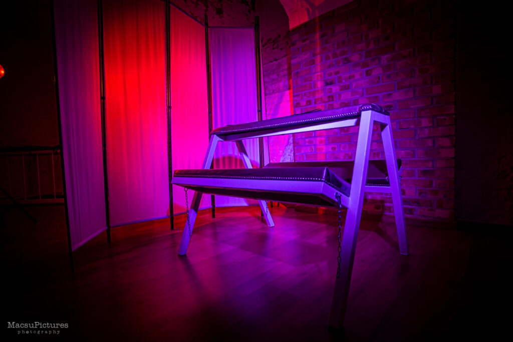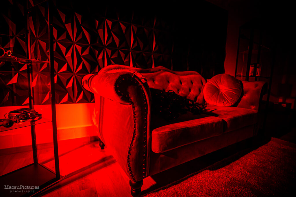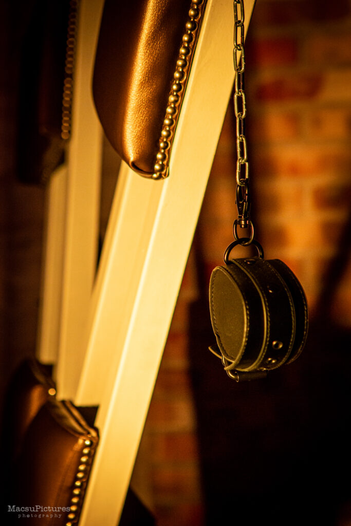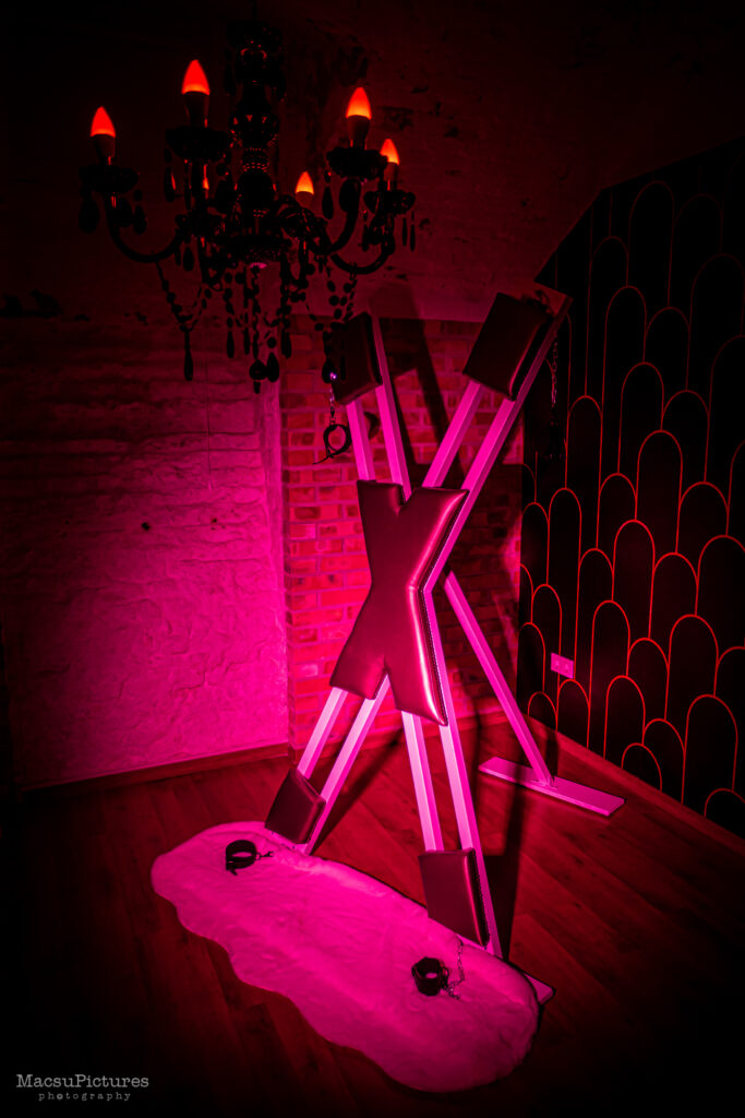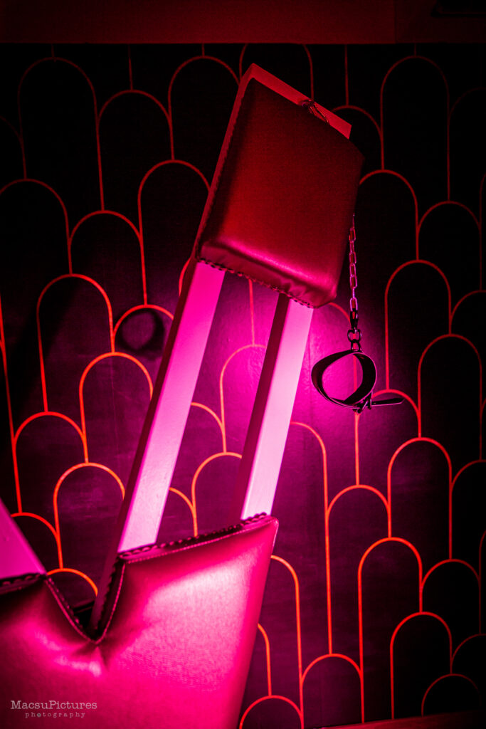Fehér és pezsgőarany tónusú, BDSM ihletésű bútorok, valamint kellékekkel és kiegészítőkkel berendezett vitrinek teremtenek olyan vizuális világot, amely egyszerre inspirál alkotásra és segít kiszakadni a hétköznapokból. Legyen szó fotózásról vagy önkifejezésről, a tér arra hív, hogy megvalósítsd a saját, egyedi elképzeléseidet.