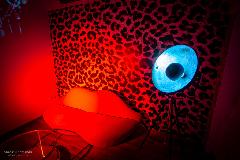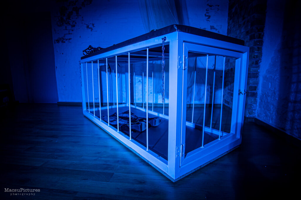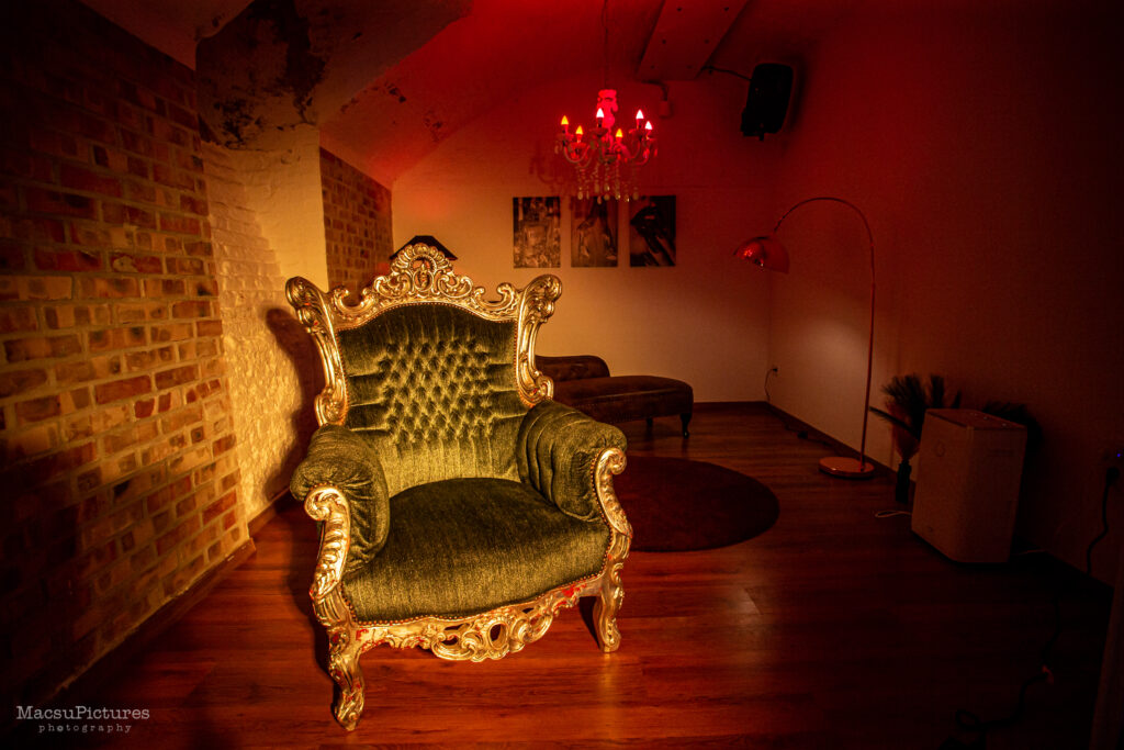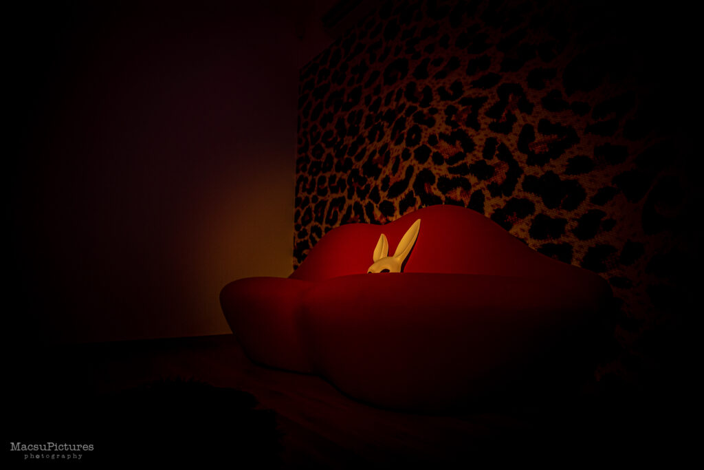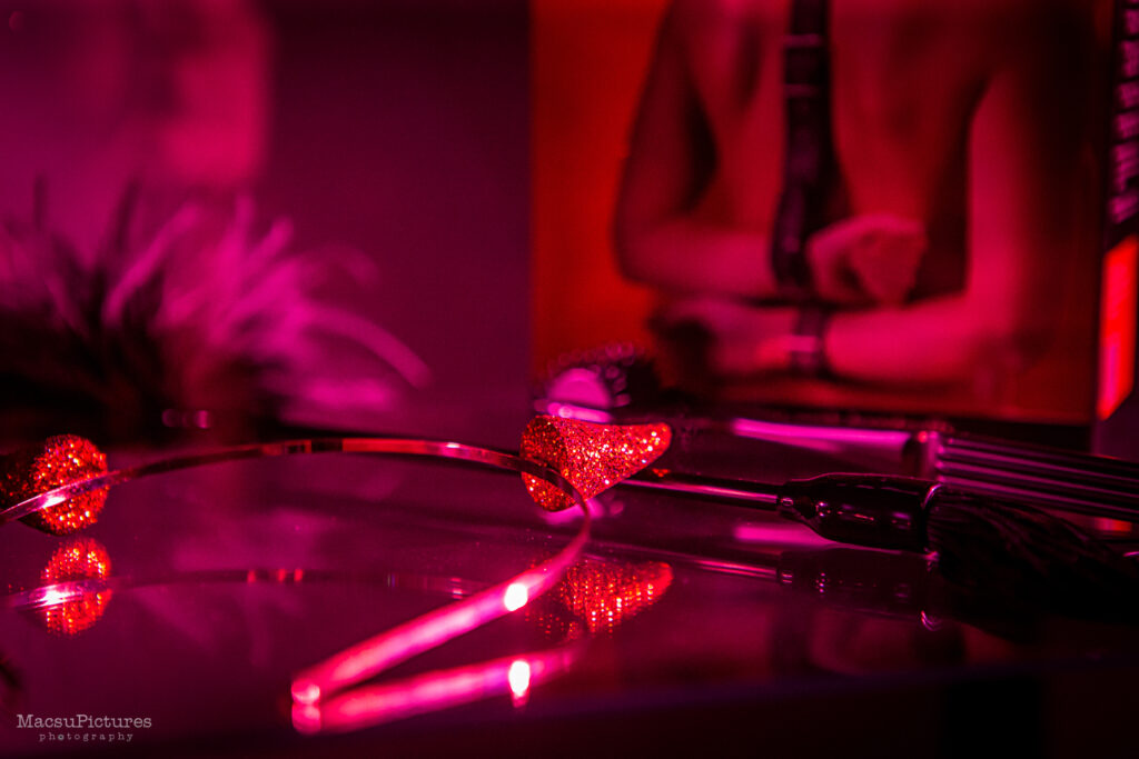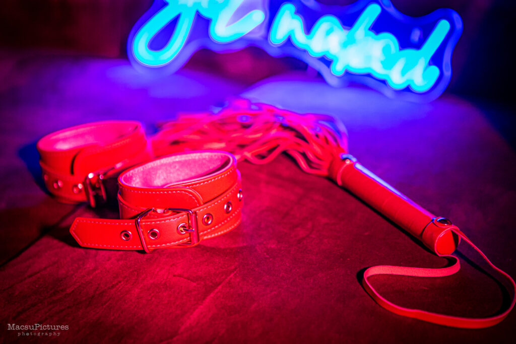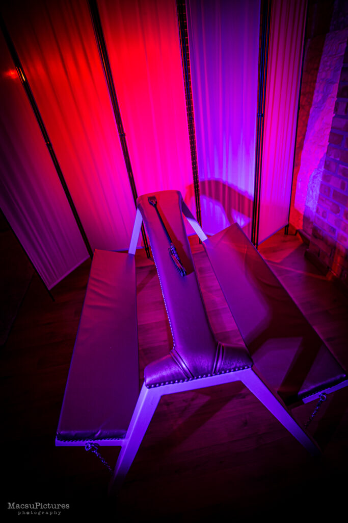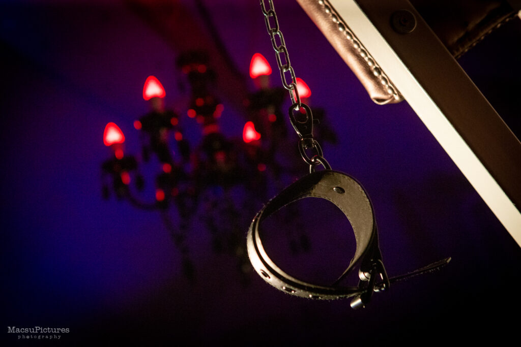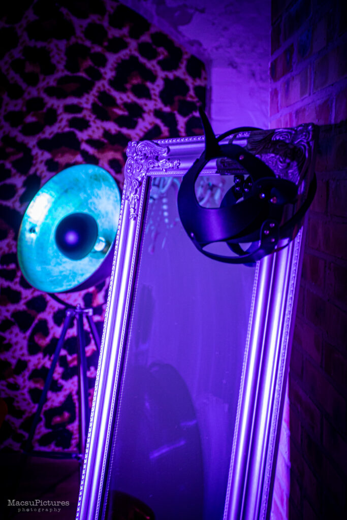Fehér és pezsgőarany tónusú, BDSM ihletésű bútorok, valamint kellékekkel és kiegészítőkkel berendezett vitrinek teremtenek olyan vizuális világot, amely egyszerre inspirál alkotásra és segít kiszakadni a hétköznapokból. Legyen szó fotózásról vagy önkifejezésről, a tér arra hív, hogy megvalósítsd a saját, egyedi elképzeléseidet.